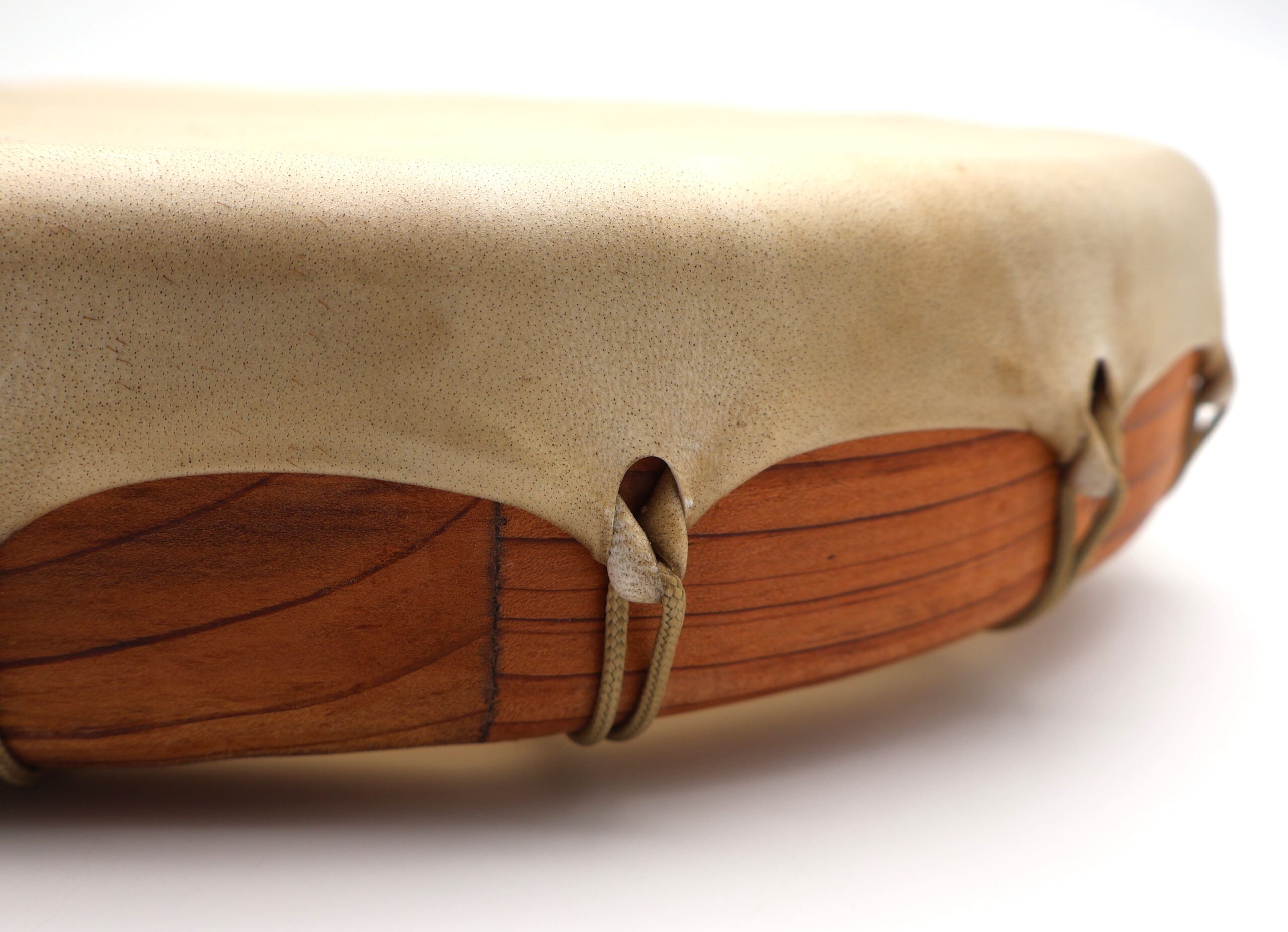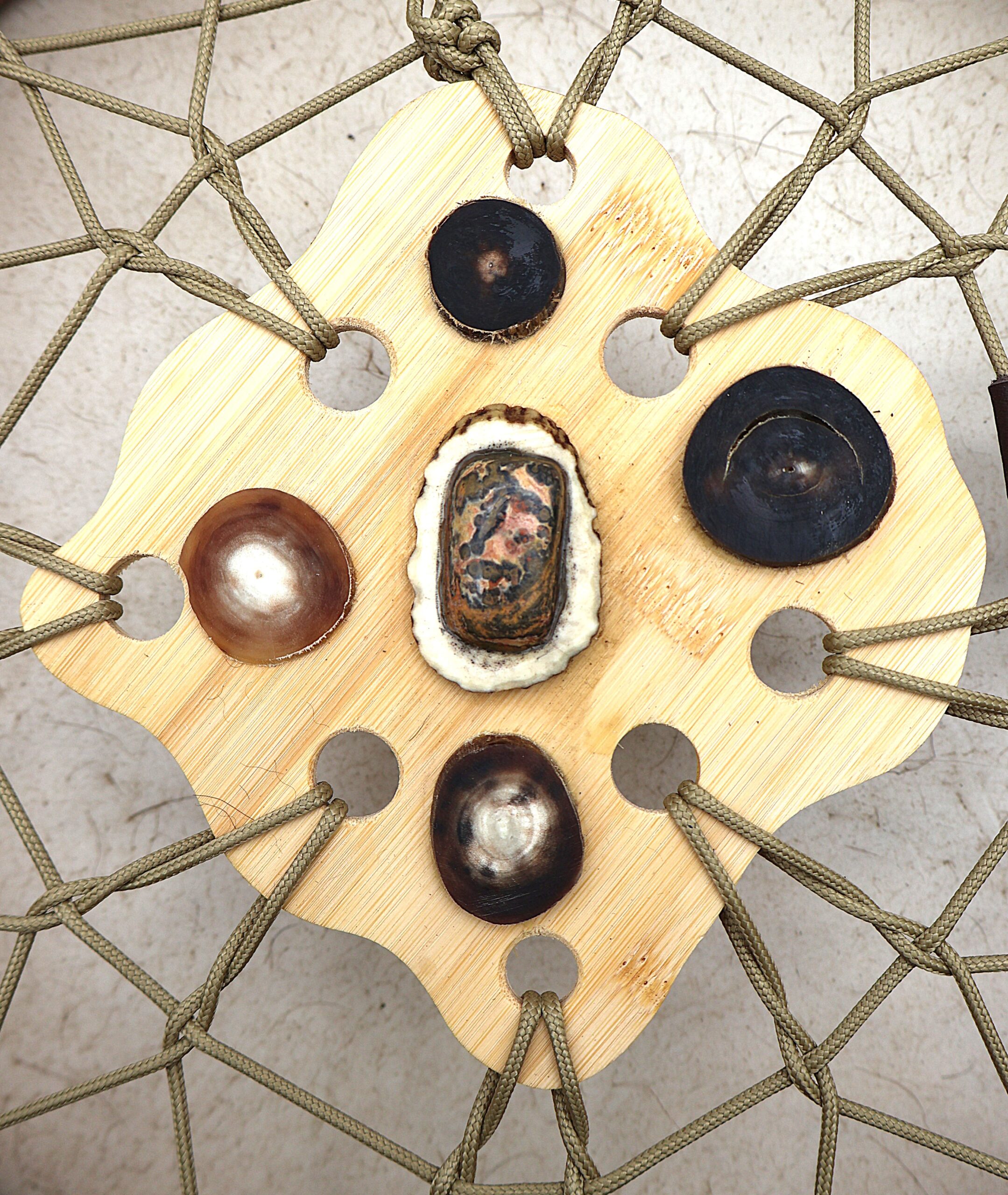 Le cadre en séquoia offre une résonance chaude et profonde, tandis que la peau de biche confère au son une texture douce, fluide et enveloppante. La prise en main ornée de quatre cornes de cerf et en son centre, une jaspe pop vient renforcer l’ancrage et la stabilité énergétique du tambour.