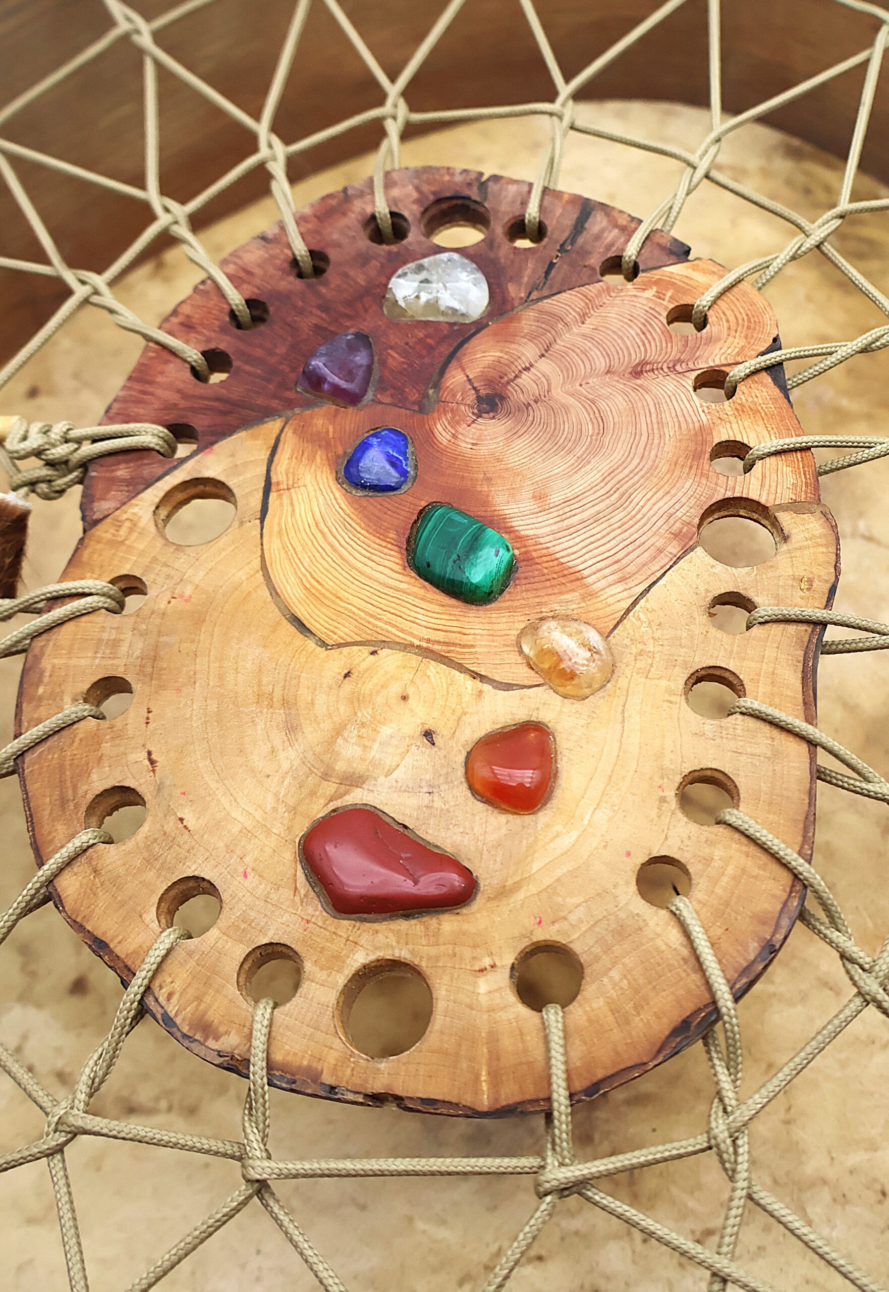 Ce tambour chamanique 7 chakras est une création unique de Gabriel Oko, artisan renommé pour son travail d’exception et son lien profond avec les matériaux naturels.