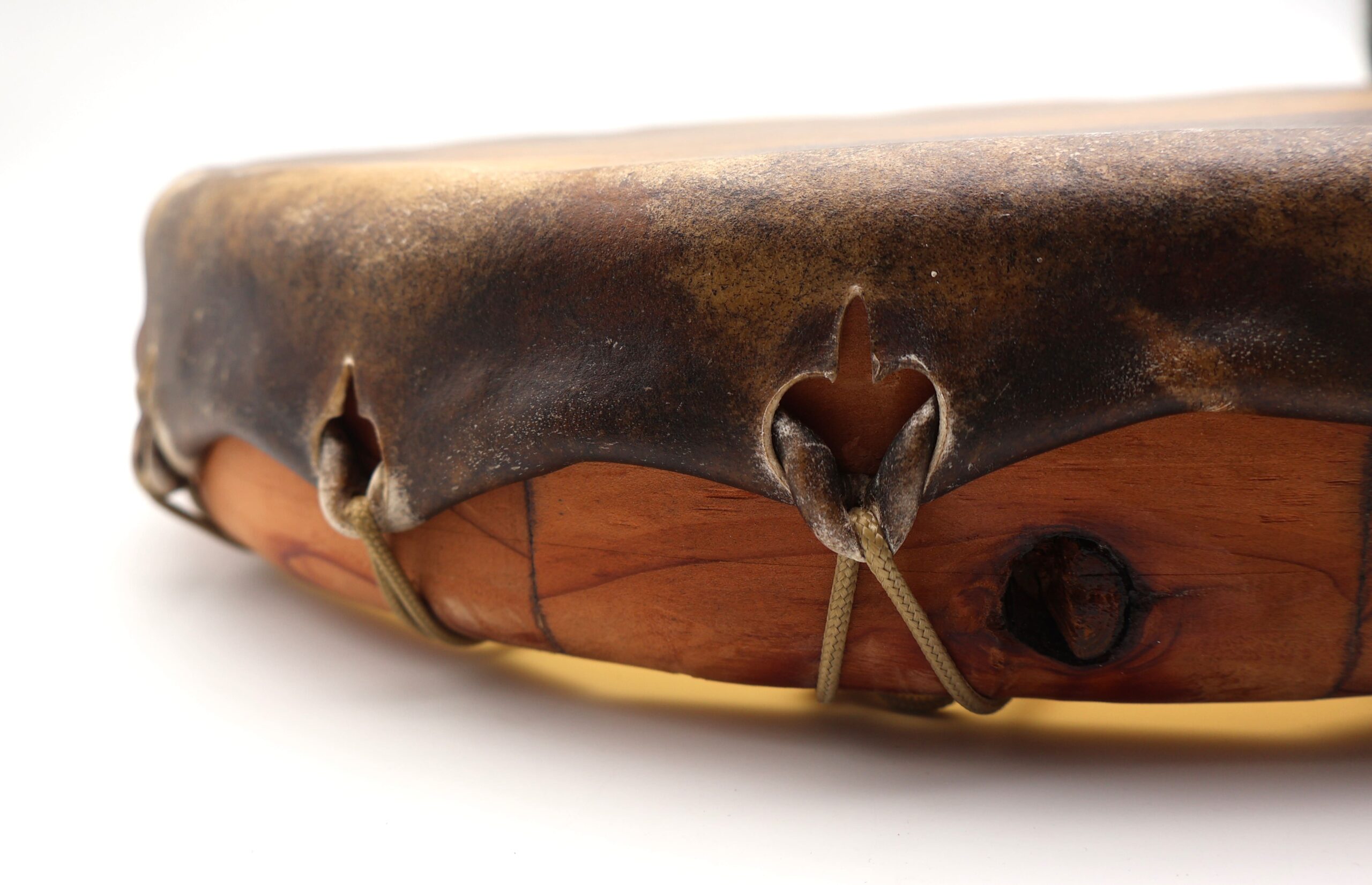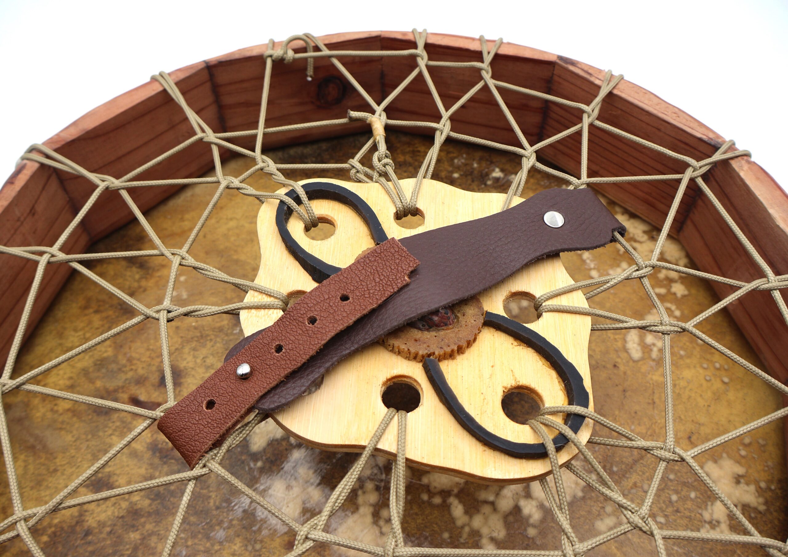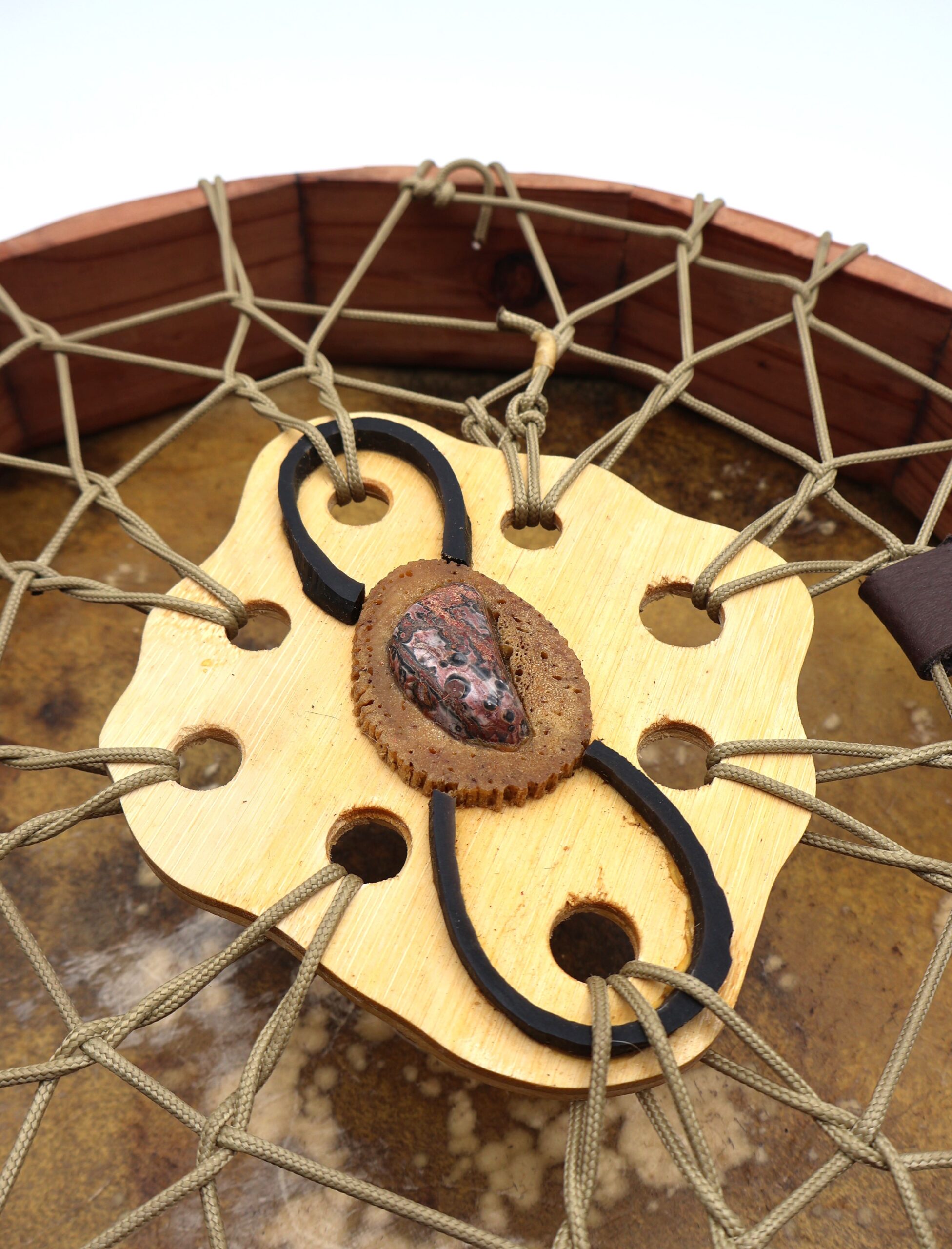 La peau de taureau lui confère une puissance sonore impressionnante. La prise en main ornée d’une corne de gazelle et en son centre, une jaspe pop, liée au chakra du cœur.